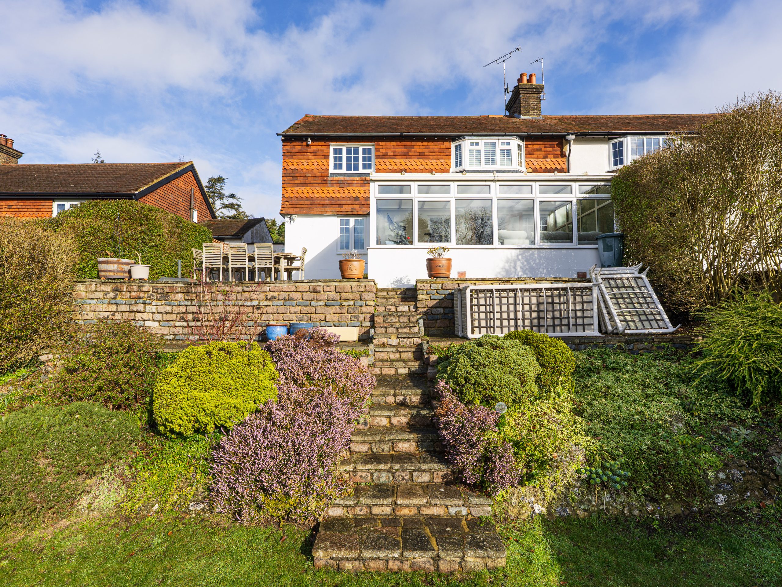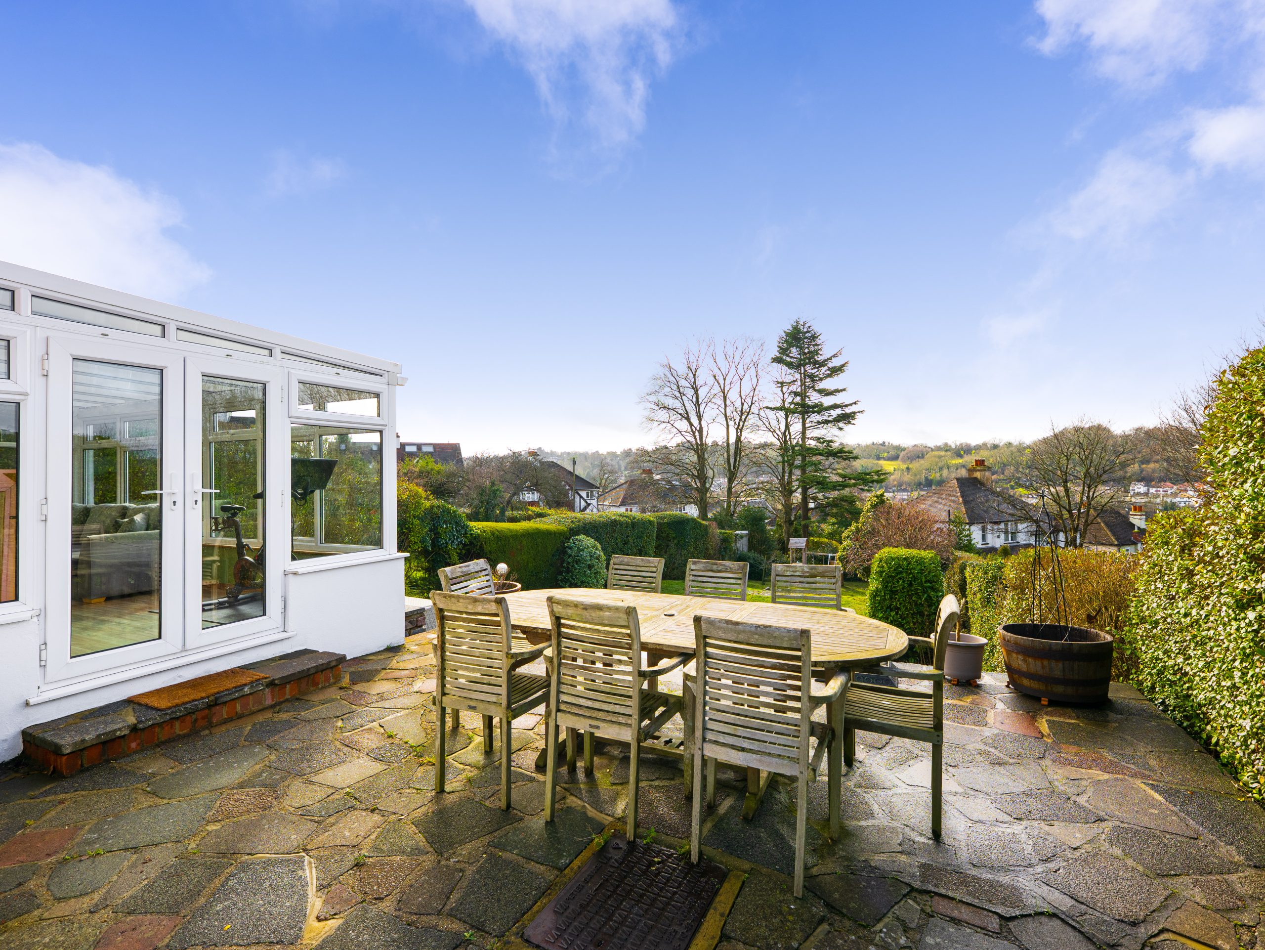 Externally, the rear garden extends to approximately 120ft in length and enjoys a southerly aspect. The elevated patio takes full advantage of the far-reaching views and afternoon sun. To the front, there is driveway parking and an attached garage.