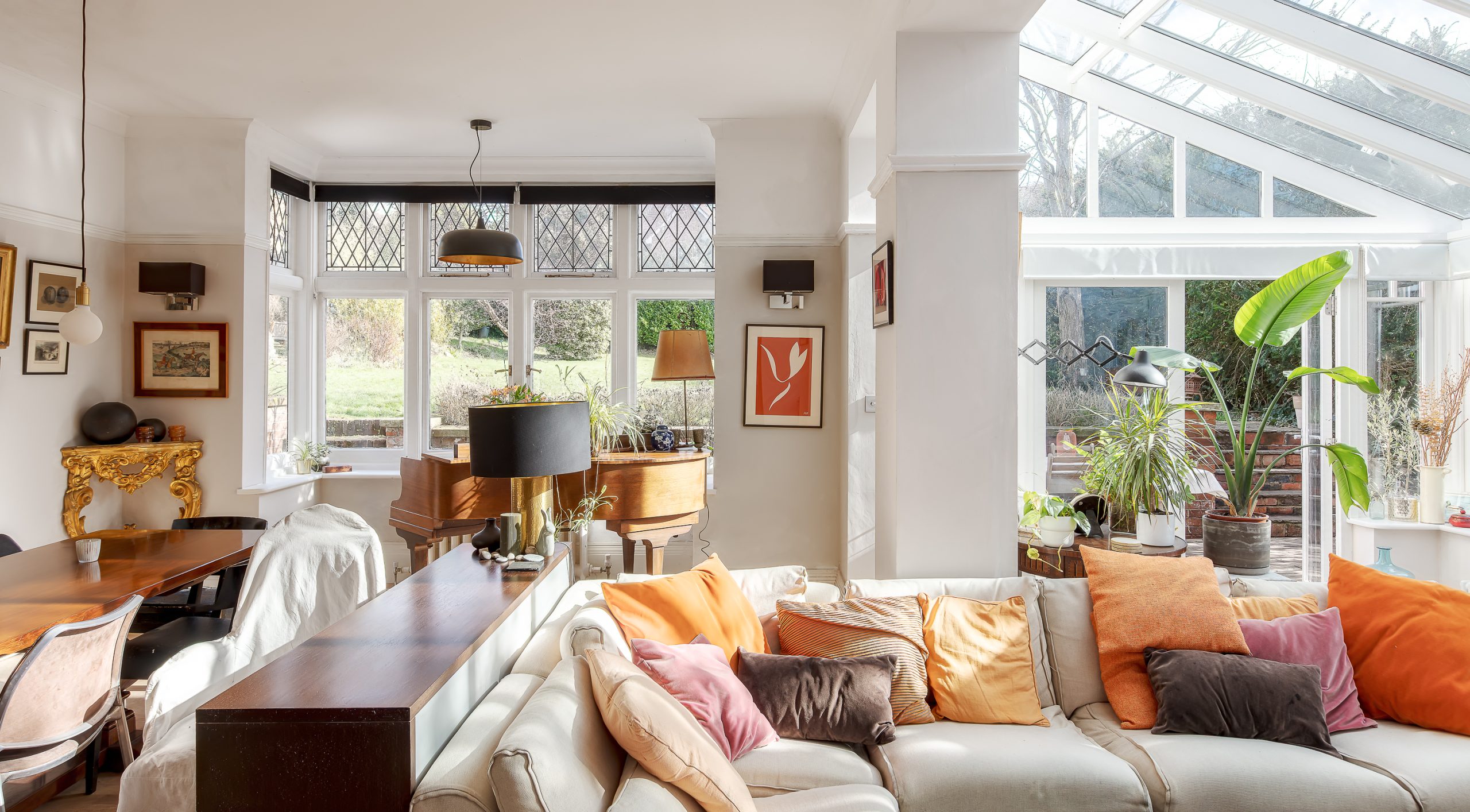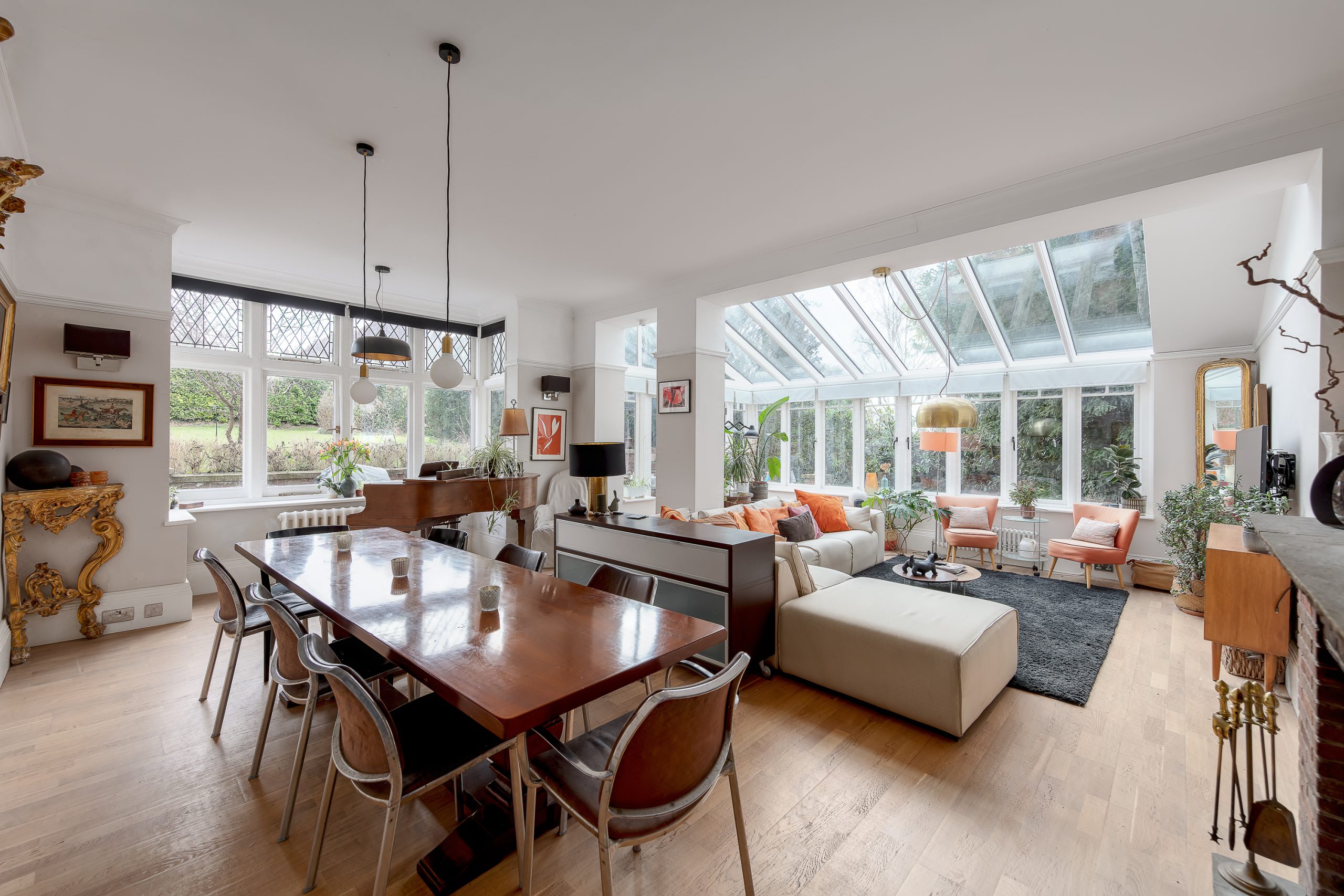 From the moment you step inside, the proportions are immediately apparent. The welcoming entrance hall leads through to beautifully balanced reception spaces, including an impressive living and dining room measuring over 24 feet, filled with natural light and period features such as fireplaces, leaded-light windows and original brass door furniture. There is also a separate family room with a grand-scale bay window providing a more relaxed space for everyday living, along with a study that works perfectly as a home office.